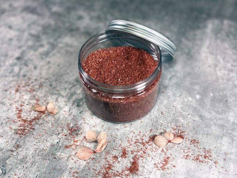 Clay can also act as a natural dye. Because our salt is pink, we’ve opted for red clay which should provide a beautiful, earthy, burgundy-like color to our bath salts.