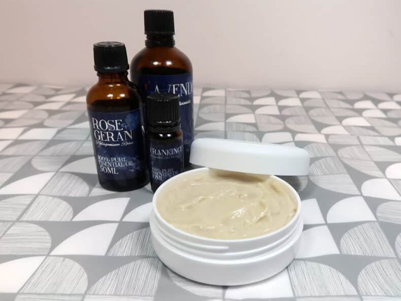 - 1 grams Vitamin E Oil, 5 drops Lavender Essential Oil, 5 drops Geranium Essential Oil, 5 drops Frankincense Essential OilContinue to stir until the oils have cooled to below 104f ( 40c) then add the vitamin E and the essential oils.