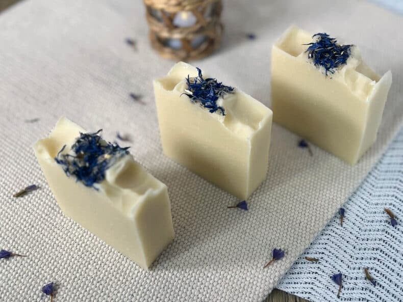 This simple cold process recipe brings out the very best of lavender essential oil. A calming vibe, a gentle lather, and a touch of cornflower petals for a beautiful flourish. This bar is both soothing and beautiful, the perfect soap!