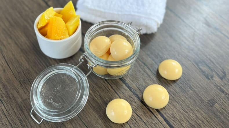 The recipe combines cocoa butter, mango butter, calendula infused oil, and candelilla wax to create a bar that feels rich but still glides smoothly across the skin. The addition of orange essential oil gives the bars a fresh, uplifting scent that makes them a joy to use.