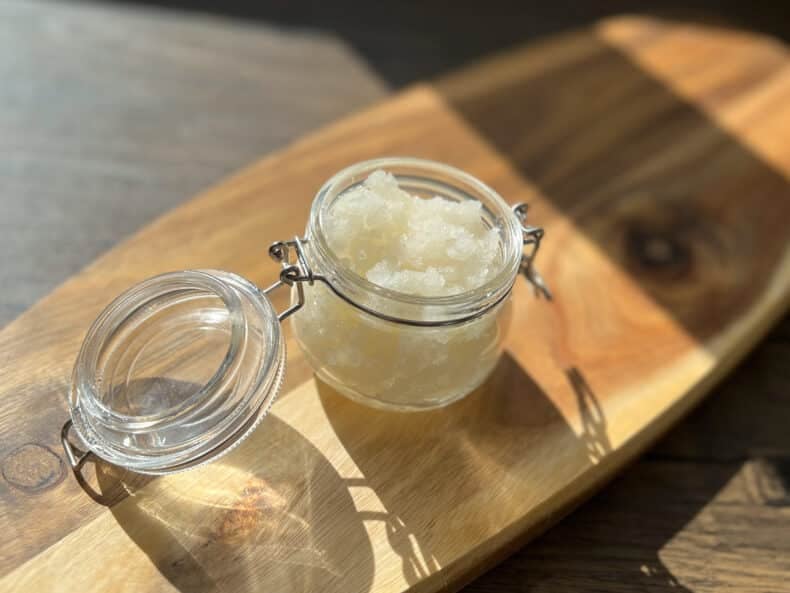Important: Because a scrub is best used while in the shower, I wanted something that would allow the oils to mix with the water and slip down the sink without leaving much behind. You can leave this out, but be careful in the shower! There is also no great substitute, so there’s not much reformulating we can do to make this product more natural.
