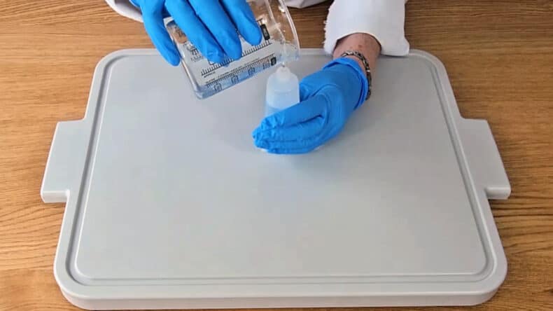 Now its time to check the pH of the cleanser. Dilute a small sample of the cleanser (1 part cleanser to 9 parts distilled water). Dip a pH strip into the diluted sample and check it reads pH 5.0–5.5.