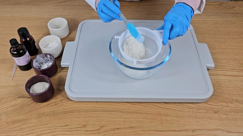 Put on your face mask, place a sieve over one of the bowls and Sift the clay into it. Then carefully sift the SCI powder into the same bowl. Being careful not to cause too much soap dust. Do the same with the arrowroot and the oatmeal.