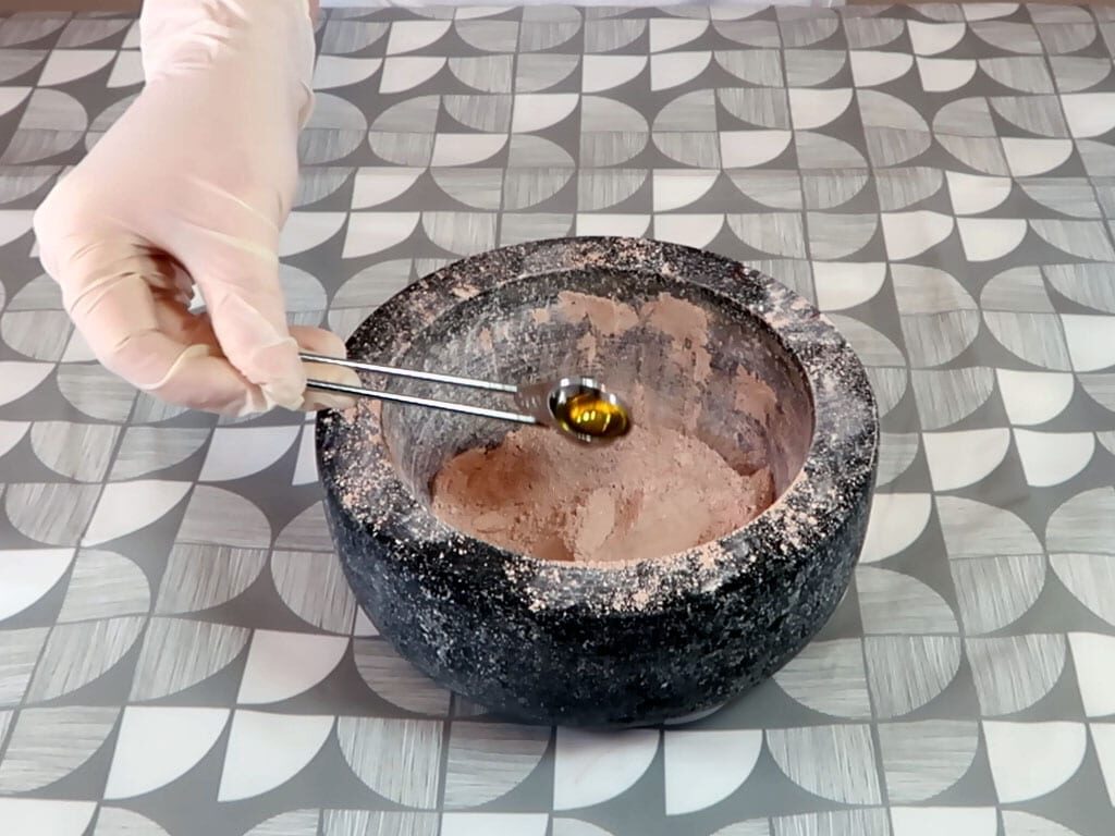 Once you are happy with the color and consistency of the powder, it's time to add the jojoba oil and essential oil if you are using it. Mix these in well until they are fully cooperated into the powders.